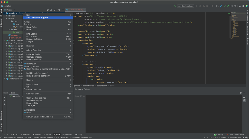먼저 프로젝트 이름 위에서 마우스 오른쪽 버튼을 클릭하여 Add Framework Support…메뉴를 클릭