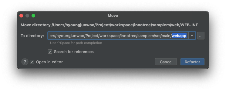 이렇게 옮기면 IntelliJ는 리팩토링 창을 띄워 확인할 것이다. 그냥 Refactor를 누르면 이동이 완료된다.