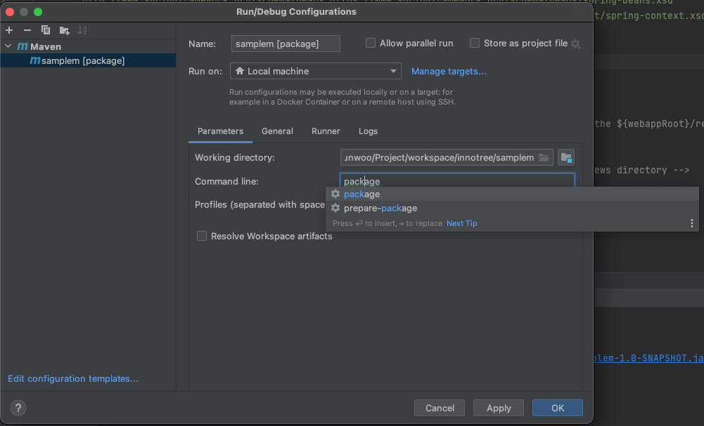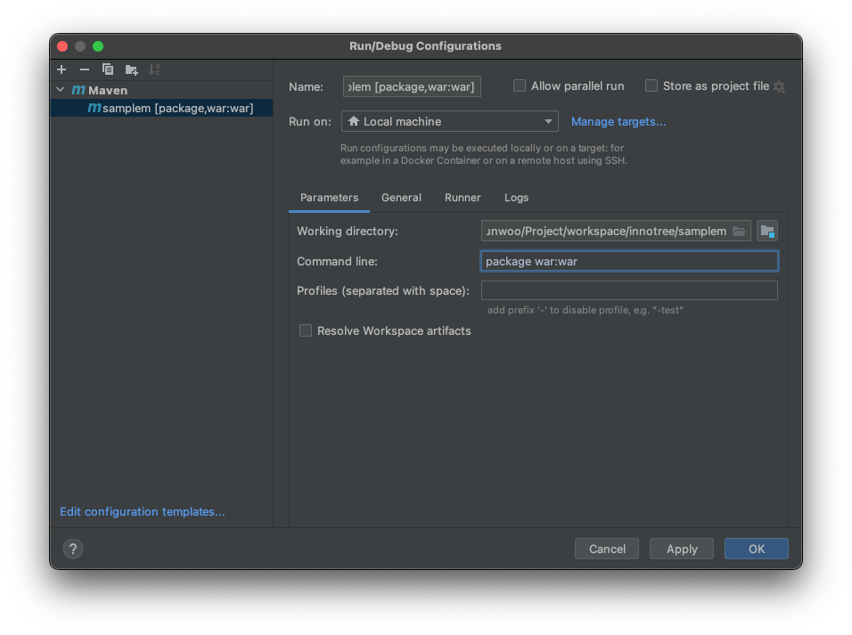 이름을 간단히 적어주고 중앙에 있는 Command line 항목에는 package war:war를 입력해준다.