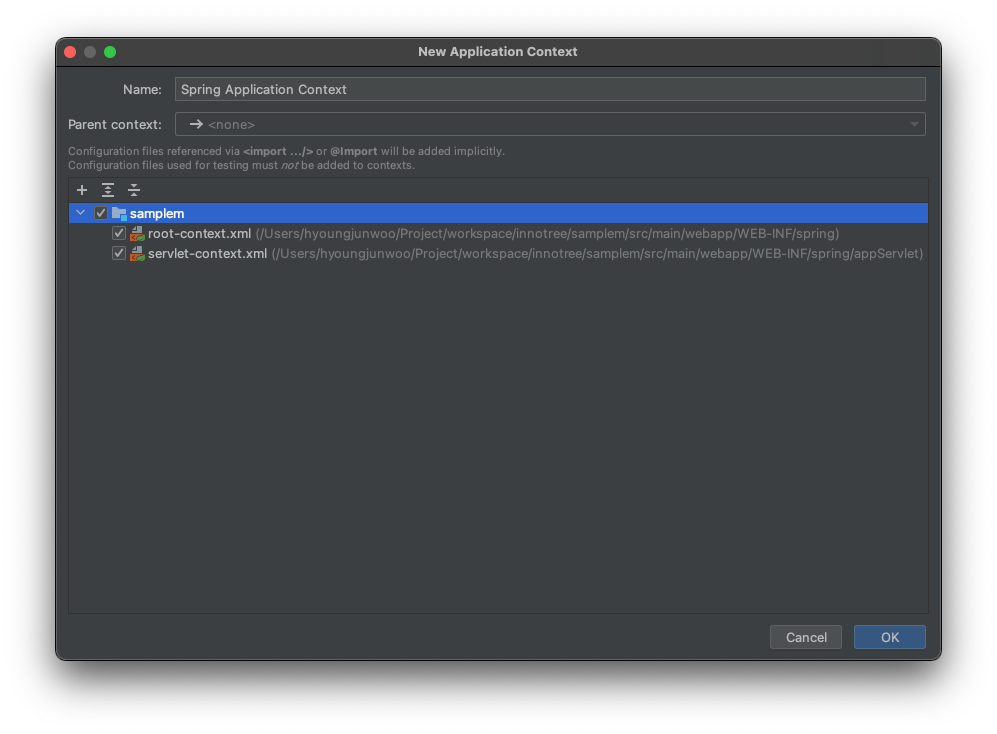 새롭게 New Application Context 창이 열리고 우리가 새로 만든 2개의 context.xml 파일을 선택할