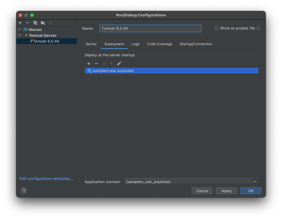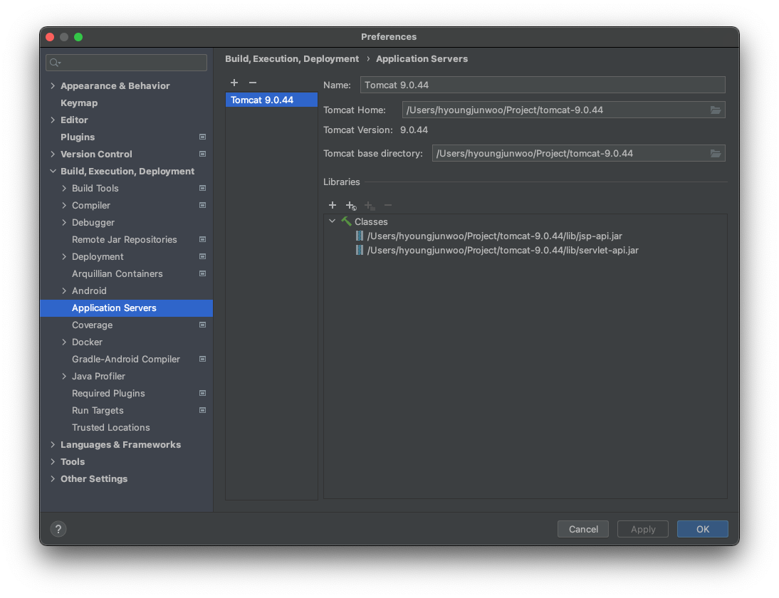 다음은 톰캣 연동이다. 톰캣은 이미 PC에 설치되어 있고 IntelliJ에 아래와 같이 설정이 되어 있다는 전제