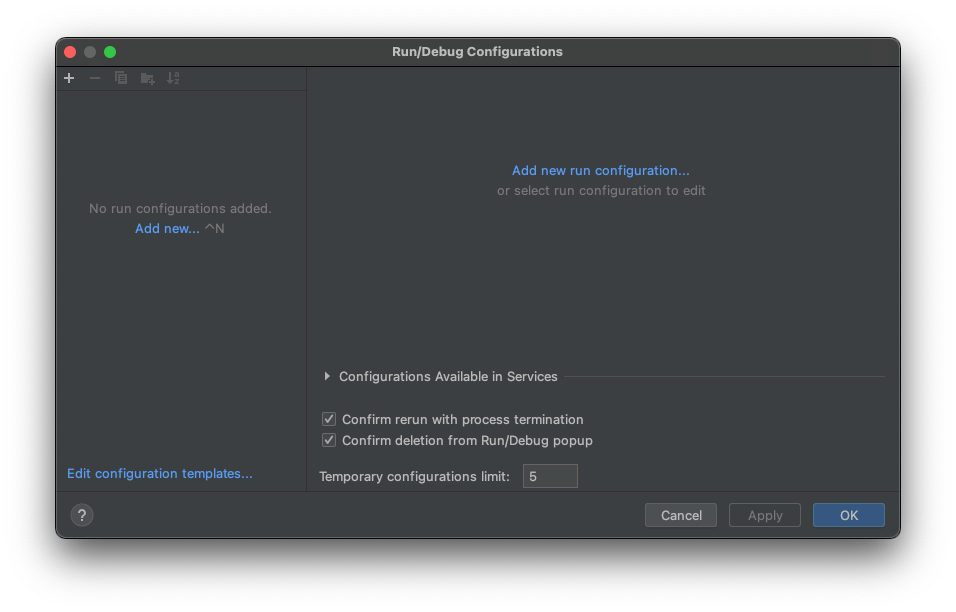화면 좌측 상단의 + 버튼, 좌측의 Add New…, 한복판의 Add new run configuration…어디를