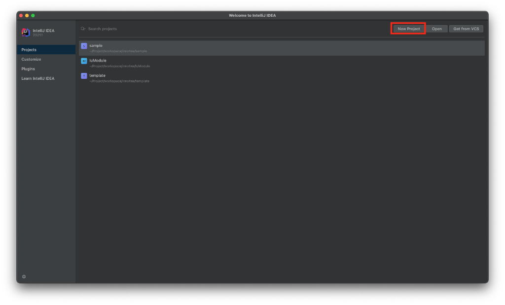 경우 화면 구성이 약간 다르겠으나 New Project, Open, Get from VCS 3개의 버튼은 동일하게