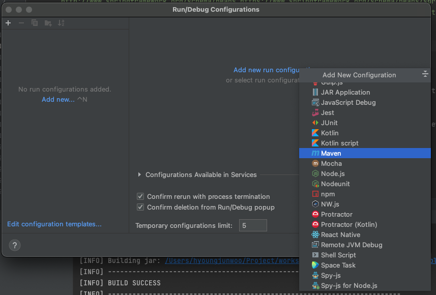 눌러도 설정을 추가할 수 있는 팝업 메뉴가 열린다. 우리는 Maven 프로젝트이니 Maven을 선택하자.