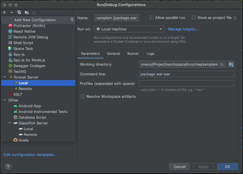 Maven 설정을 추가할 때와 동일한 진행을 하고 Add new run configuration에서 Tomcat Server > local을 선택한다.