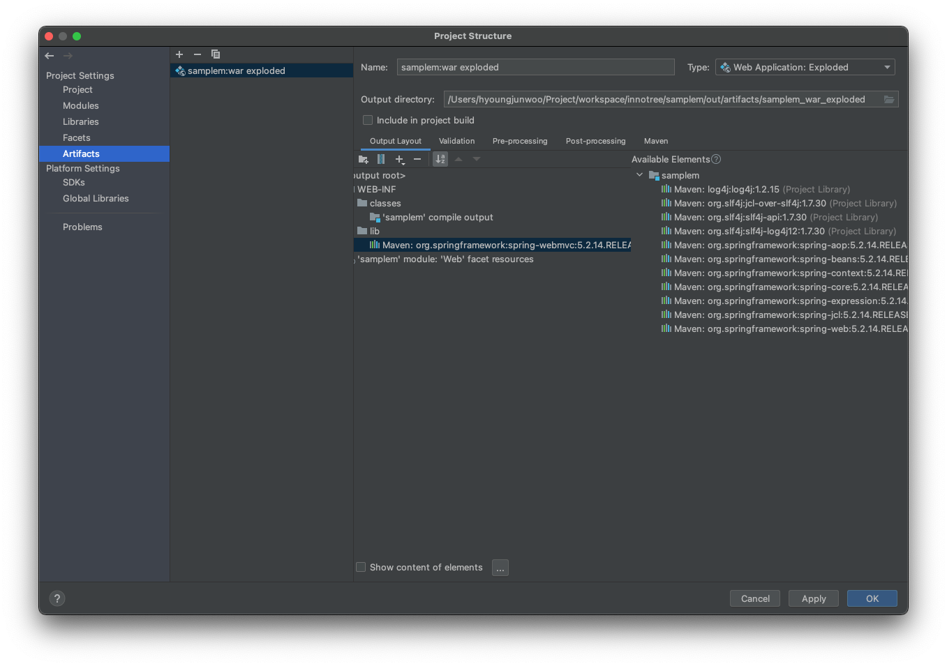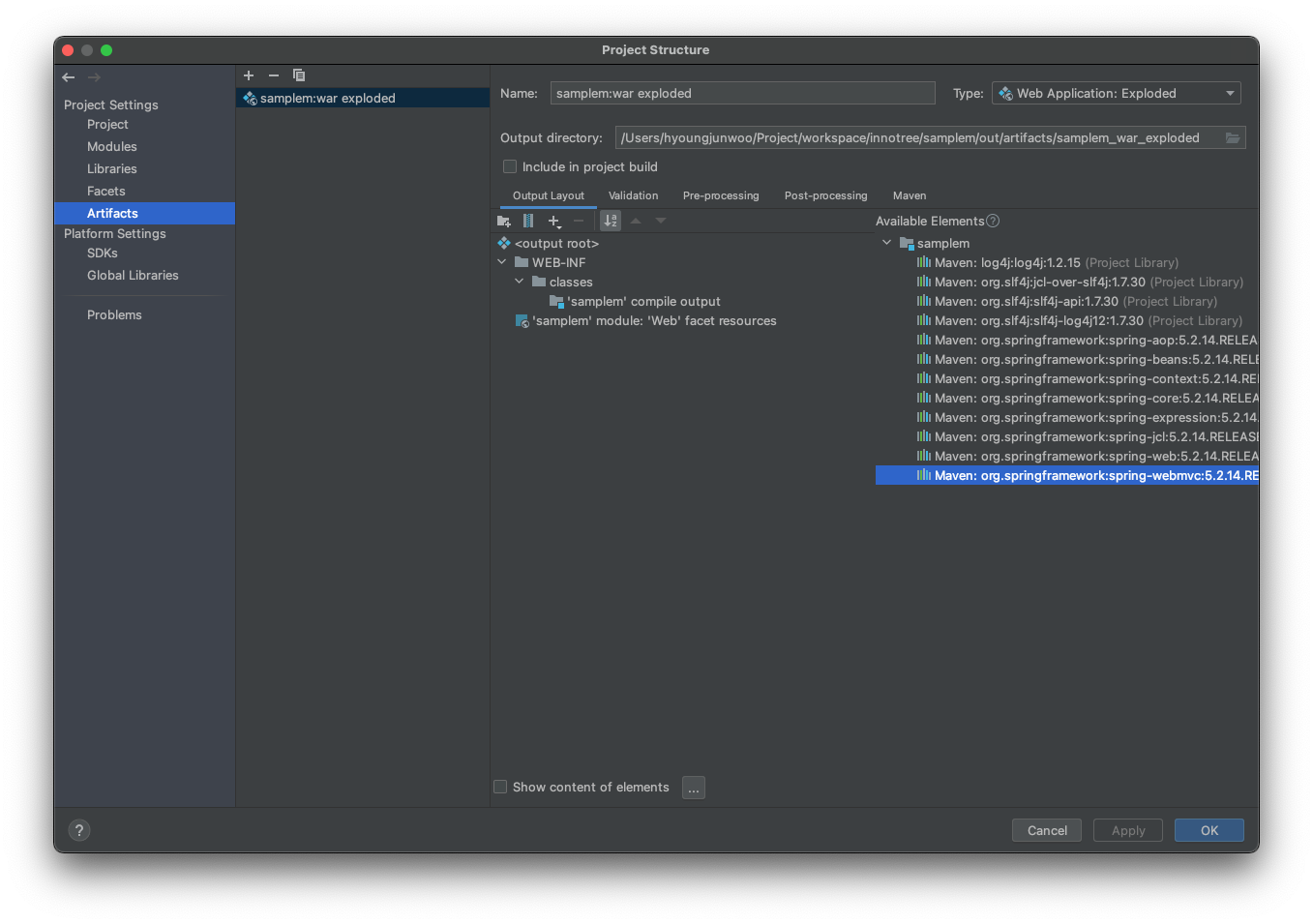 - Artifacts : Deploy와 관련된 내용들이 보여진다. 프로젝트를 발드했을 때 어떤 형태로 저장되는지, 어느 위치에 저장되는지, 어떤 내용들이 포함되는지 등을 설정한다.