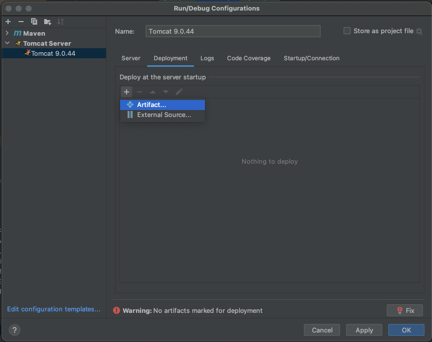 Tomcat 설정 창에서 Deployment 탭을 선택하고 + 버튼을 눌러 Artifact…를 선택하면 아까