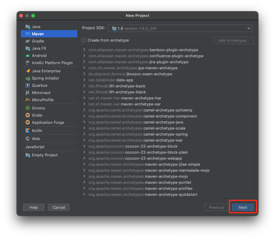 New Project 창의 좌측 프로젝트 타입에서 Maven을 선택해 주자. Project SDK만 잘 설정이 되어