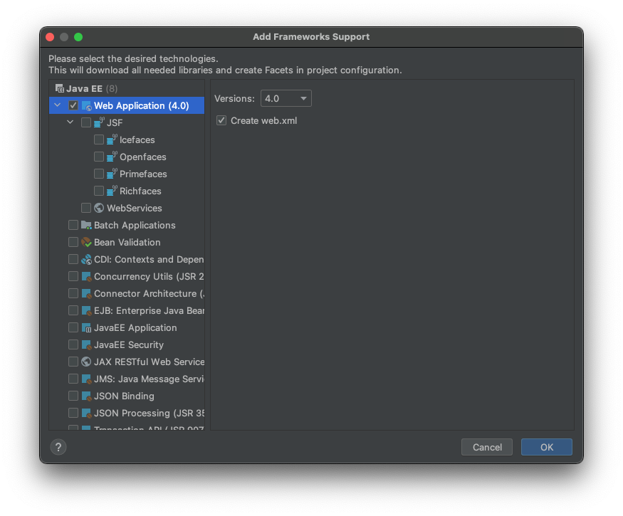 Add Framework Support 창이 열리면 좌측 프레임워크 목록에서 Java EE 아래 있는 Web Application (4.0)을 선택하고 OK 버튼을 누른다.