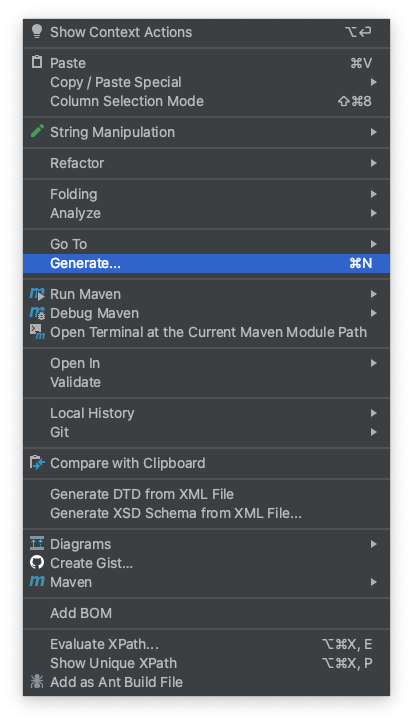 pom.xml 파일에서 마우스 우측 버튼을 누르고 컨텍스트 메뉴에서 Generate...를 선택하고 이어