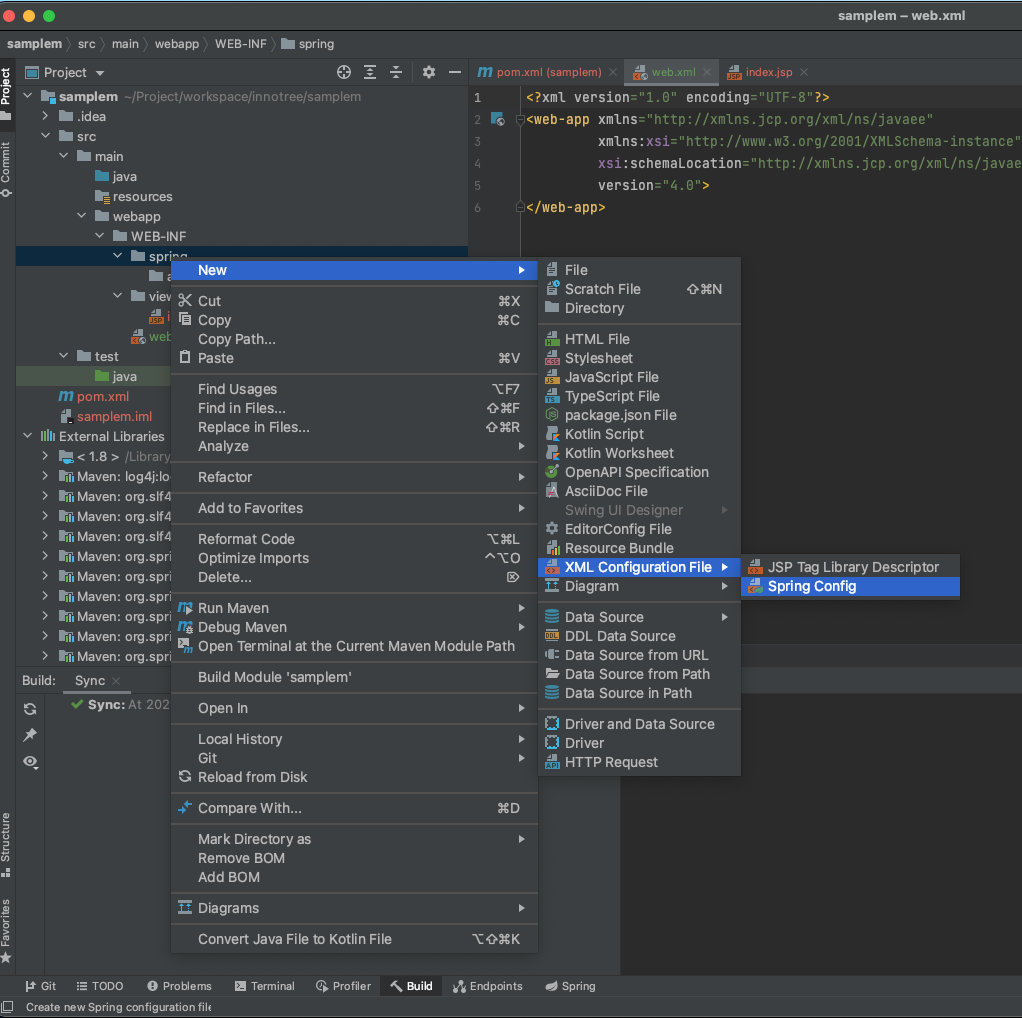 오른쪽 버튼을 클릭하여 New > XML Configuration File > Spring Config를 차례대로 클릭한다.
